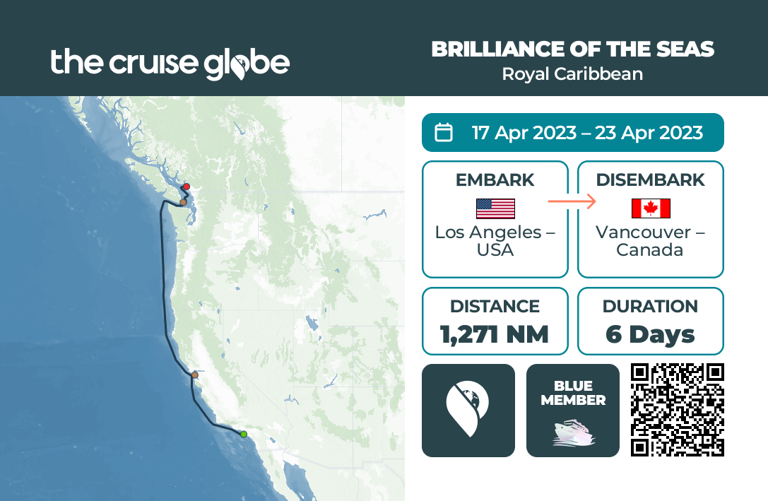 We are going on a cruise on the Brilliance of the Seas, a Royal Caribbean ship. This is going from Los Angeles to Vancouver, Canada.
